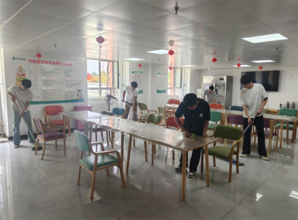 在公共區(qū)域,實踐團成員則齊心協(xié)力開展環(huán)境清潔。他們擦拭餐桌、拖掃地面,將食堂與休息區(qū)打理得整潔明亮。煥然一新的空間,讓老人們在日常用餐與休閑時擁有更加舒適的環(huán)境,也獲得了工作人員的肯定。