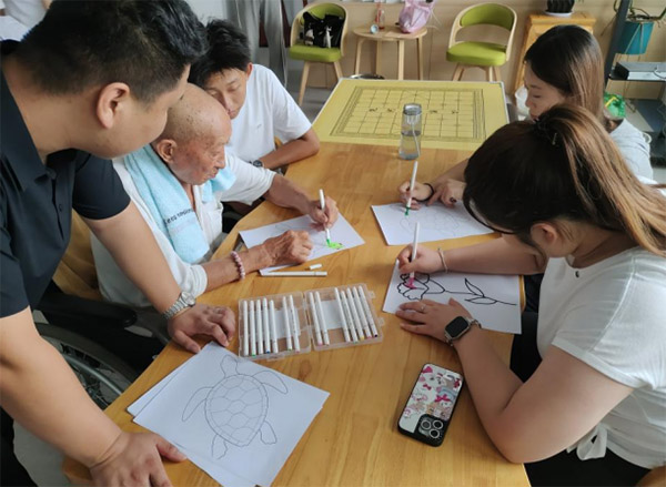 圖為實(shí)踐團(tuán)成員與老人畫畫