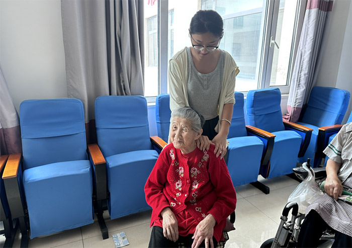 成員們為老人提供了貼心的按摩服務。他們根據事先學習的按摩手法,幫助老人緩解肩頸酸痛,傳授給老人們一些養老保健的小知識。