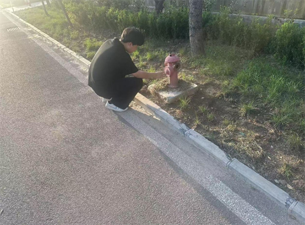 實踐團成員還對院區(qū)的安全設(shè)施進行檢查。在傍晚的陽光下,志愿者蹲下身來仔細查看室外的消防栓,確認其是否能正常使用,進一步提升了敬老院的安全保障水平。
