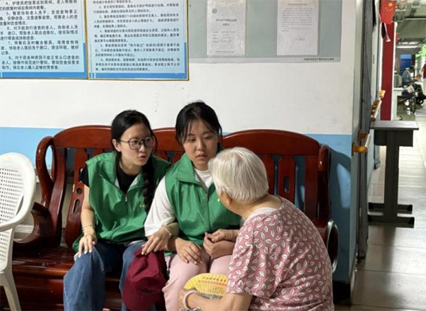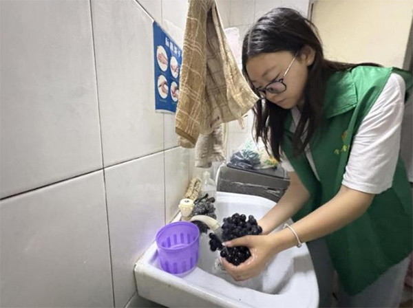 次日,實踐團給老人們買來葡萄、香蕉等新鮮水果,幾位成員細心地將葡萄一顆顆沖凈,隨后為他們發水果。她朝著不遠處的老人搭話,老人笑著回應,場面十分融洽。