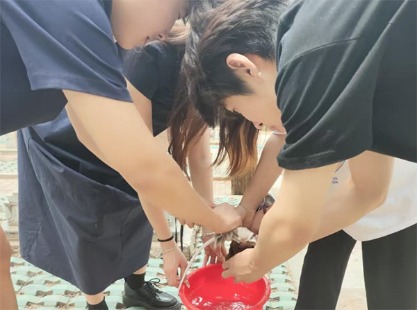 圖為“蒼柏行”實踐團成員拎水清理環境
