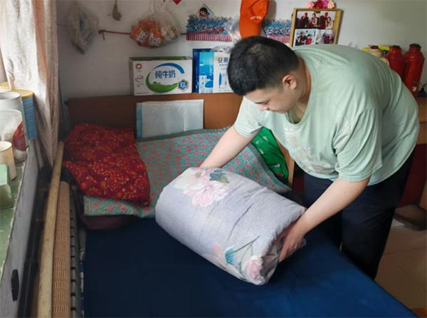 圖為“程源”實(shí)踐團(tuán)成員為老人整理床鋪