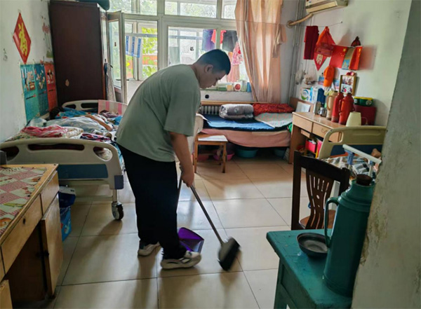 在養(yǎng)老中心的居室中,實(shí)踐團(tuán)成員俯身打掃房間,仔細(xì)將地面清掃干凈,確保每一個(gè)角落都整潔舒適。床鋪凌亂時(shí),實(shí)踐團(tuán)成員輕輕整理被褥,讓房間重新煥發(fā)溫馨氣息。這一細(xì)致的勞動(dòng)不僅改善了老人的居住環(huán)境,也讓老人們感受到家的溫暖。
