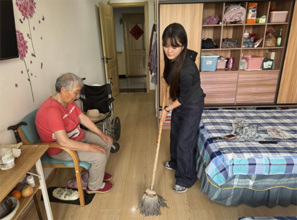 實(shí)踐團(tuán)成員承擔(dān)起打掃老人房間衛(wèi)生的任務(wù),她們細(xì)心地擦拭桌椅、窗臺(tái),認(rèn)真清掃地面,將房間里的雜物擺放整齊,為老人們營(yíng)造出整潔舒適的居住環(huán)境。