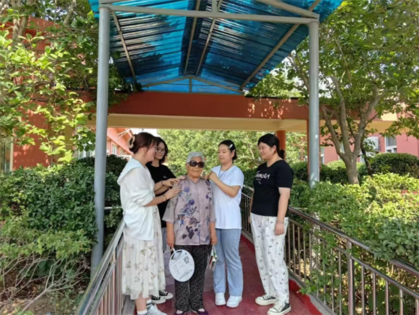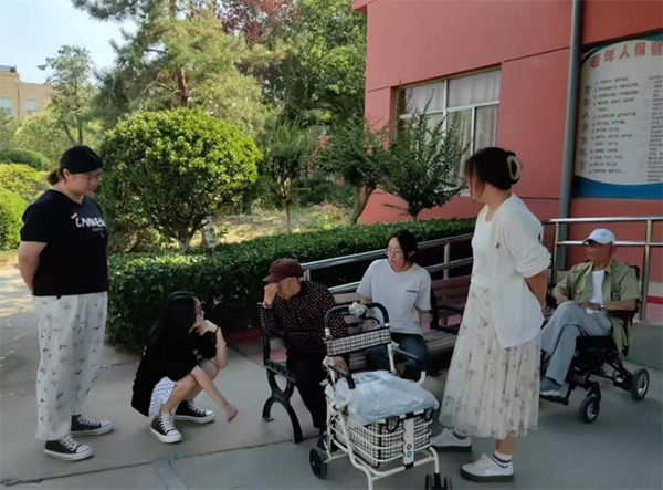 在院子里,志愿者們陪伴行動不便的老人散步或乘坐輪椅出行,主動與老人拉近距離。有人彎下身子與坐在長椅上的老人耐心交談,有人陪伴在輪椅旁輕聲關心,使得院內隨處可見青春與夕陽相映的溫暖畫面。