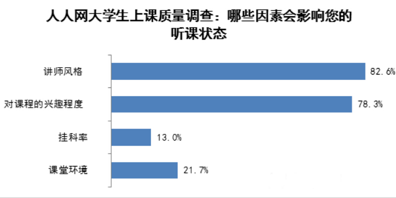 調(diào)查發(fā)現(xiàn),必修課與選修課的出勤情況幾乎持平,未發(fā)生逃課現(xiàn)象的占比分別為39.1%和38.7%,偶爾會(huì)逃課的占比分別為36.8%和39.2%。過(guò)去大學(xué)常說(shuō)的“必修課選逃,選修課必逃”似乎已經(jīng)成過(guò)去時(shí)。而在影響大學(xué)生課程出勤率方面,選修課與必修課卻有著明顯的區(qū)別。結(jié)果顯示,是否點(diǎn)名成為影響大學(xué)生專(zhuān)業(yè)課出勤率最主要的因素,占比達(dá)到82.6%,講師格同樣也是最主要的影響因素之一,占到56.5%。而在選修課方面,大學(xué)生認(rèn)為點(diǎn)名似乎并不那么重要,這部分僅42.5%,而講師風(fēng)格與興趣愛(ài)好的影響更為突出,分別為60.5%和53.9%。人人網(wǎng)大學(xué)生用戶(hù)研究中負(fù)責(zé)人介紹說(shuō),目前大學(xué)中的藝體類(lèi)選修課程開(kāi)設(shè)較廣,一方面是教育部要求,另一方面這類(lèi)課程也能更能增加大學(xué)生之間的社交機(jī)會(huì),普遍受到大學(xué)生喜愛(ài)。一些熱門(mén)課程更是會(huì)出現(xiàn)搶課的現(xiàn)象。北京林業(yè)大學(xué)的楊同學(xué)就表示,“現(xiàn)在已經(jīng)讀大三了,學(xué)校有個(gè)叫做兩性關(guān)系的課四個(gè)學(xué)期都沒(méi)有搶上。”