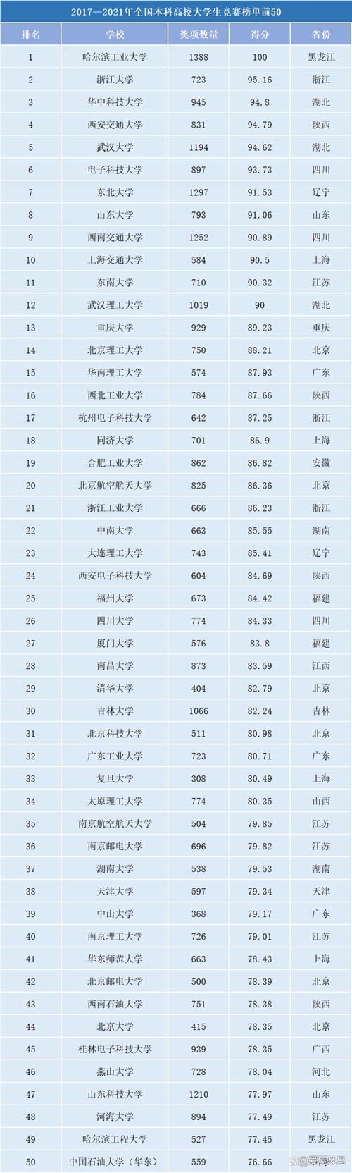 競賽成果在一定程度上反映出學校的教育水平和人才培養質量。大學生參與各類競賽不僅有助于提升創新意識、實踐能力,同時也是展示學校教學質量和綜合實力的一張最好的名片。近日,中國高等教育學會發布了2017—2021年全國本科院校大學生競賽榜單,下面就來看看都有哪些高校進入前50強。