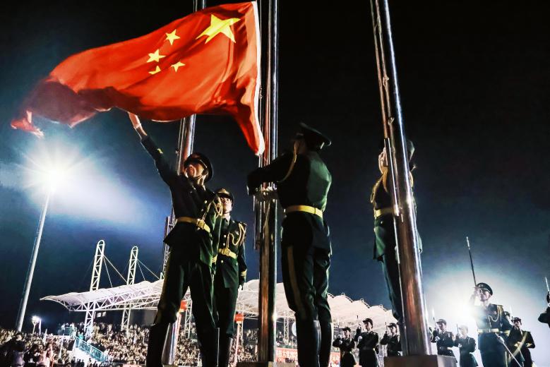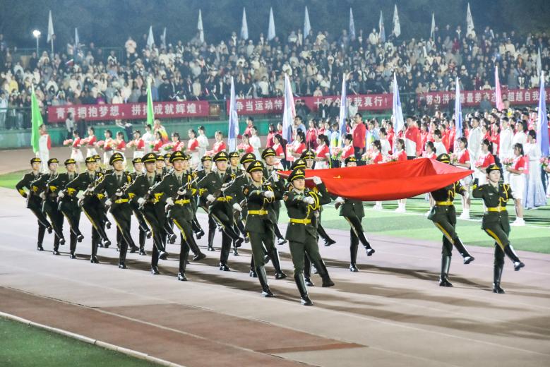 伴隨著激昂的運動員進行曲,由學校領導、各學院學生、校工作人員組成的方陣隊伍依次邁著整齊的步伐經過主席臺。他們精神抖擻、意氣風發,高亢嘹亮的口號展現出師生們的朝氣與活力。“請全體肅立,升國旗、奏國歌!”號令聲響,護旗手們踏著鏗鏘有力的步伐將國旗緩緩送至升旗臺,五星紅旗在全場師生的注目下冉冉升起。