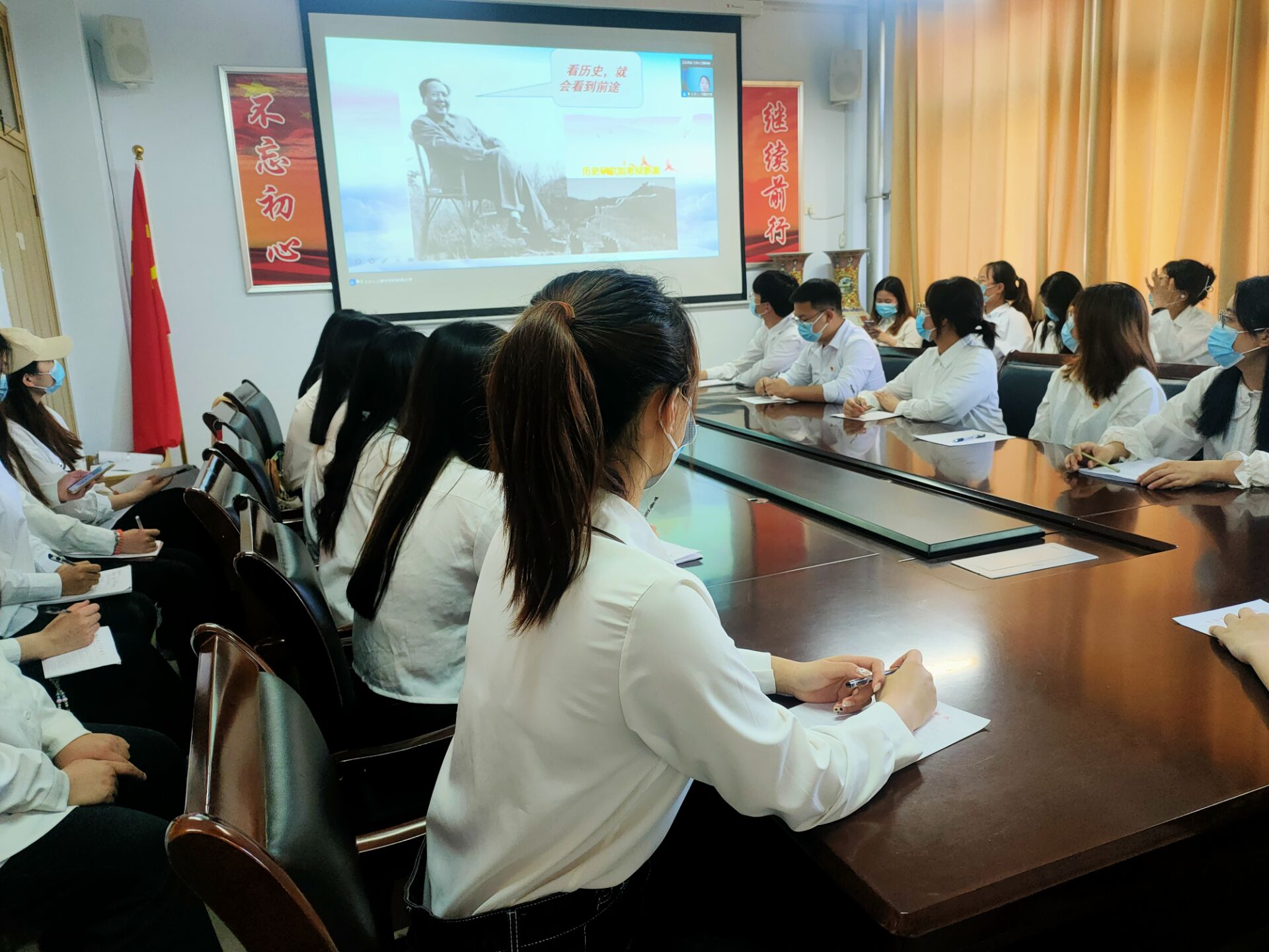 會上,參會成員進行線上視頻會議學習,通過觀看《黨領導中國青年運動的光輝歷程》,使同學們全面了解五四運動以來,在黨的領導下,中國青年運動走出的一條根植于中國歷史和現實、具有強烈時代特征和鮮明中國特色的發展道路。同時,該視頻要求青年要勇挑重擔、勇克難關、勇斗風險,勇做走在時代前列的奮進者、開拓者、奉獻者。本次學習結束后,同學們紛紛表示會堅持黨的領導、高舉愛國主義旗幟、堅持永久奮斗、不懈奮斗。
