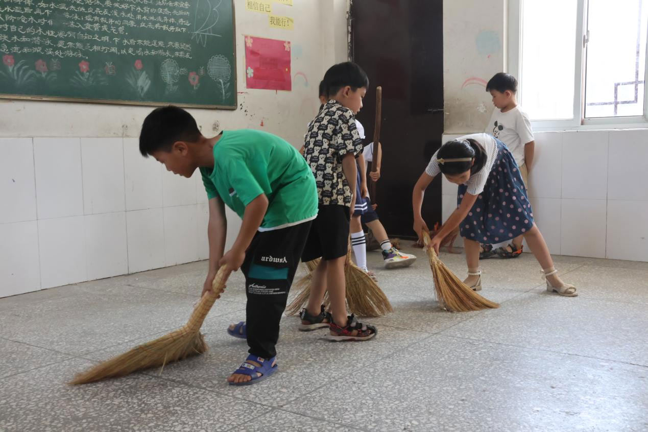 (圖為“金種子”社會實踐團隊成員和同學們一起打掃衛生。葉雯慧 攝。)