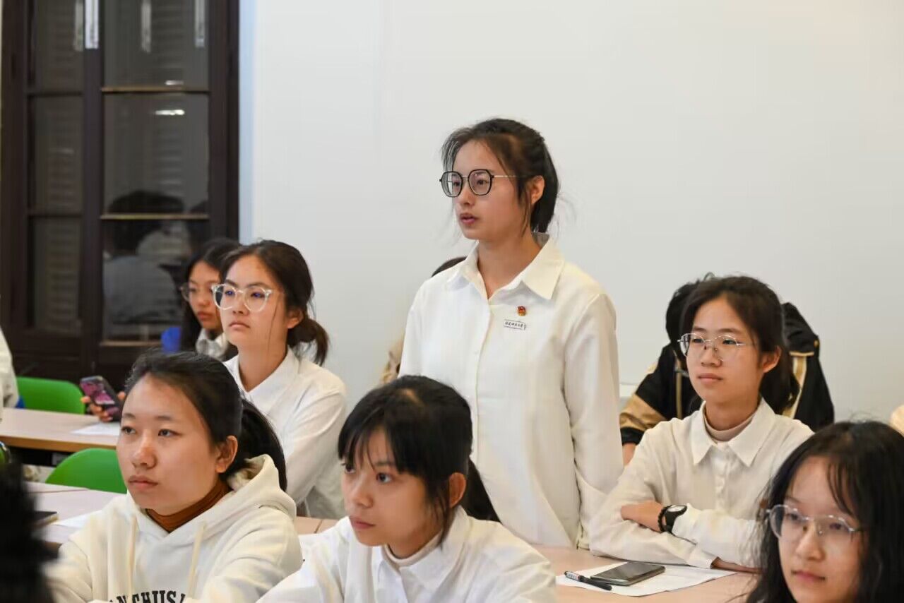 準備階段,各學習小組分配任務、各司其職、協同合作、認真鉆研《習近平著作選讀》原著中有關準備進行具有許多新的歷史特點的偉大斗爭的重要講話,并充分打磨,有條不紊地進行直至完成。發言階段,在團支書郭宇彤的組織下,每組推選出的發言代表將各小組的學習情況與延伸思考進行總結性匯報講解。從新中國成立初期到改革開放,從千禧前后到新時代中國夢,通過有血有肉青年故事的引入,真情實感青年寄言的闡發,理論在素材的引導支持與幻燈片的呈現下更為生動與深刻,調動大家更好地認識斗爭精神的現實意義。