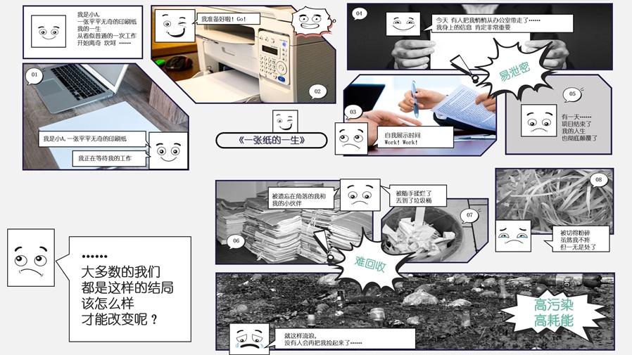 接著為同學們介紹了2020與2021年電子科技大學iGEM校隊金牌項目:生物酶法實現廢紙的原地再生。從《一張紙的一生》的漫畫故事為主線,介紹紙張生產線的高污染高耗能,讓學生思考辦公室廢紙再生的意義。以動手回收再利用一張廢紙讓同學們體會到廢紙再生的不易,意識到環保的重要意義。