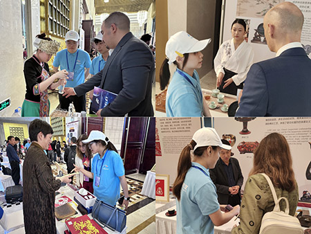 論壇期間,新洲竹雕、湖北青磚茶、麥稈畫等湖北非遺文化展位吸引了眾多外賓的目光。西語班志愿者積極為外賓們進行翻譯介紹,激發了他們對湖北非遺文化的濃厚興趣。