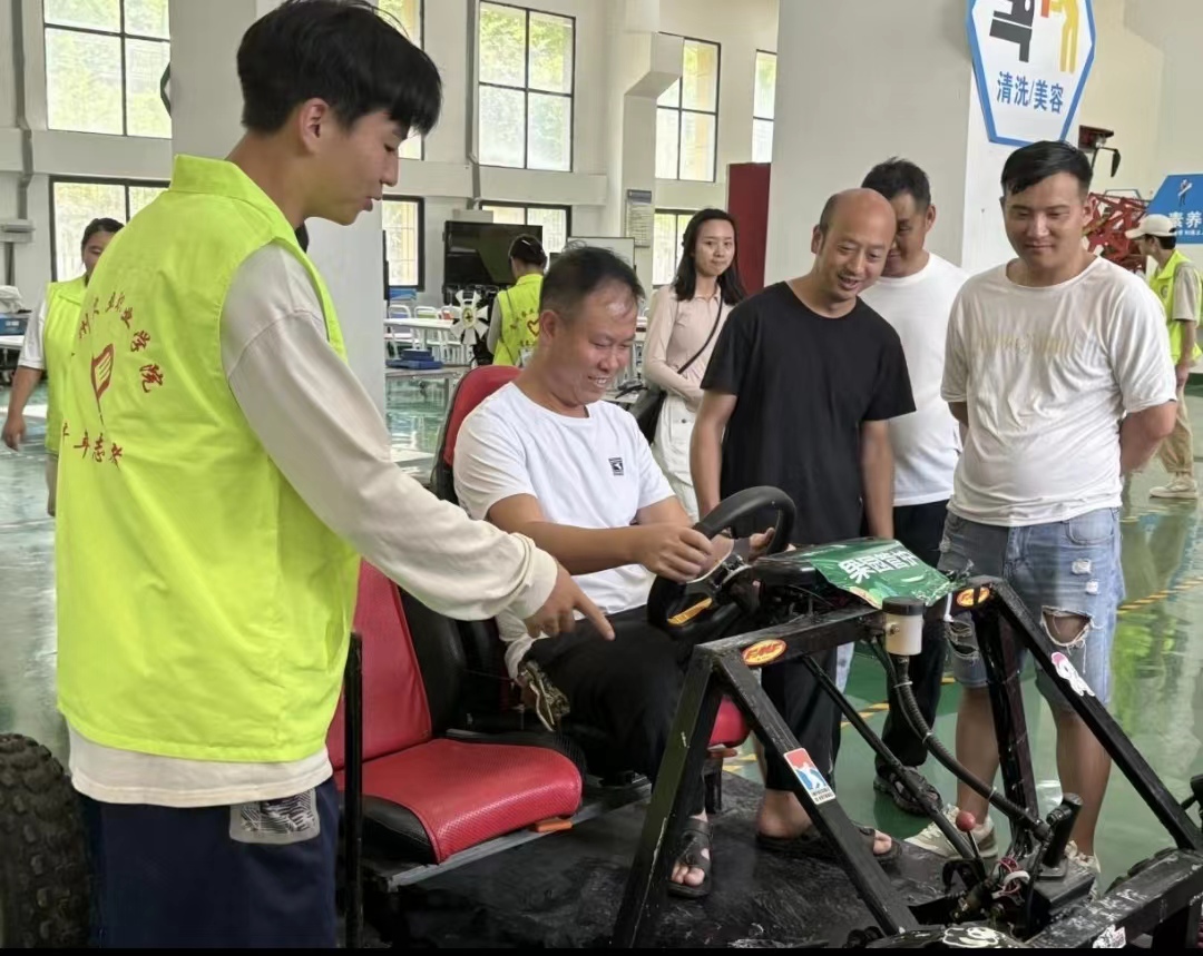 此次培訓活動旨在滿足居民對農業現代化技術的需求,提高農業生產效率和質量。培訓過程中,機電與城建系的專業教師李先品和王輝為居民講解了農機的基本構造、工作原理、常見故障及維修方法。通過理論講解、現場演示和實際操作,社區居民們更加直觀地了解了農機維護與修理的技巧和要點。參與培訓的居民們尤其對機電與城建系自主研發的幾臺果園巡邏車十分感興趣,社區居民張叔還上車感受了一下,他們向兩位教師了解了很多關于這些農機的優勢特點及研發過程。