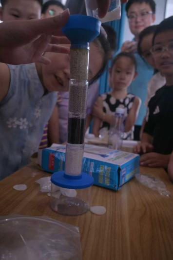 最后一站,團隊走進青陽鎮實驗小學,帶來了一堂生動的環保課。隊員們通過案例講解和互動提問,讓孩子們意識到環保的緊迫性,并踴躍表達自己的決心。隨后的“水過濾”和“水動力”實驗將氣氛推向高潮。孩子們親手用簡易材料凈化污水,觀察水車轉動理解能量轉化,在動手實踐中感受到了科學的趣味與力量。
